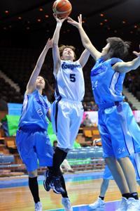 2Q:日立ハイテクは積極的なゾーン。三菱電機はセンター#24王が機能せずアウトサイドの得点に頼る。残り7分59秒23−23の同点。その後、日立ハイテクは#5山田の活躍で一気にリードし、残り7分05秒には23−28となる。三菱電機はたまらずディフェンスをゾーンに切り替えるが、日立ハイテクはよく攻めて残り4分39秒で26−33とリードする。ここが三菱電機タイムアウトを取るとオフェンスが良くなり#24王、#3宮元、#8小林、らが連続得点し、残り1分38秒、35−33逆転したところで日立ハイテクがタイムアウト。日立ハイテクは#5山田がフリースロー、2PTSで再逆転し、35−37で前半終了。
