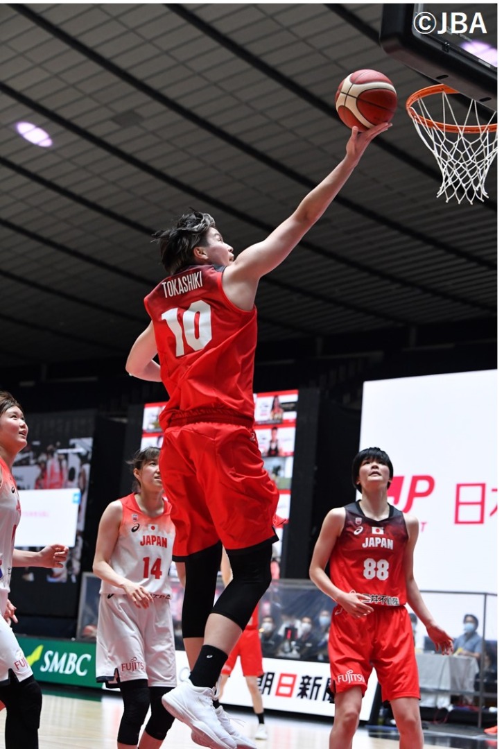 先に登場の女子は両チームが一緒に試合前のアップを行いましたが、その様子をトム・ホーバス女子日本代表ヘッドコーチがしっかりとチェック。その中で徹底されていたプレーが、ボールを持った選手がゴールへアタックし、エンドラインの選手にパスアウト、あるいはさらにエクストラパスをつないで3Pシュートを狙うプレーです。試合中も全員が意識していたようで、両チームとも積極的に取り組んでいました。所属チームの状況は異なりますが、ここに集まった選手たちの仕上がりは順調なようで、アグレッシブなプレーとリラックスした様子で時折見せる笑顔が好印象でした。