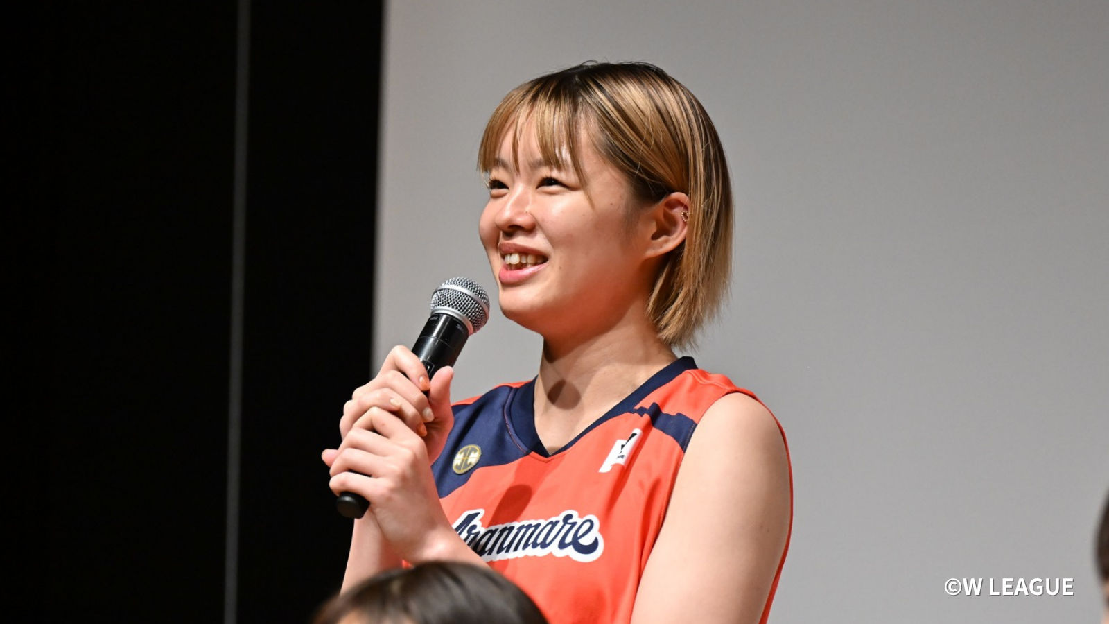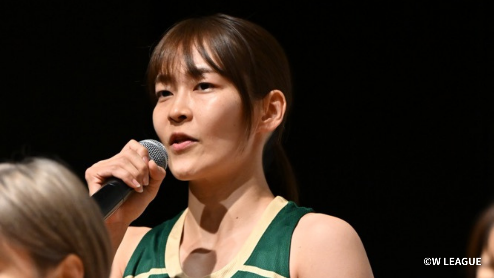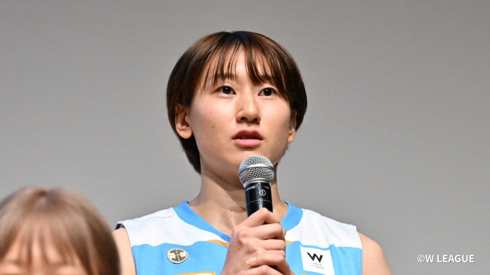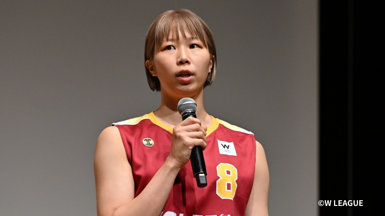 「本日は素敵な賞をいただきありがとうございます。私は小学2年生からバスケを始めて、その時からこの世界(Wリーグ)に入ることが夢でした。この夢の舞台で14年間、プレーできたことは本当に幸せに感じています。そして、たくさんの応援があったからこそだと思います。次のステージでも、自分らしく頑張っていきたいと思います。Wリーグの発展を心から祈っています。ありがとうございました。」