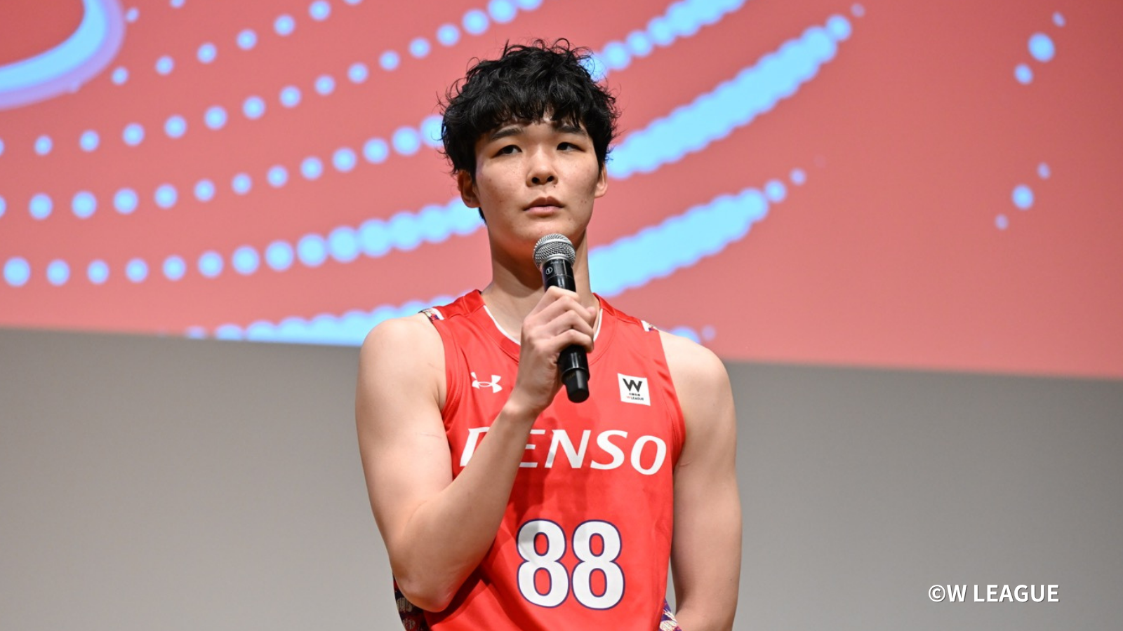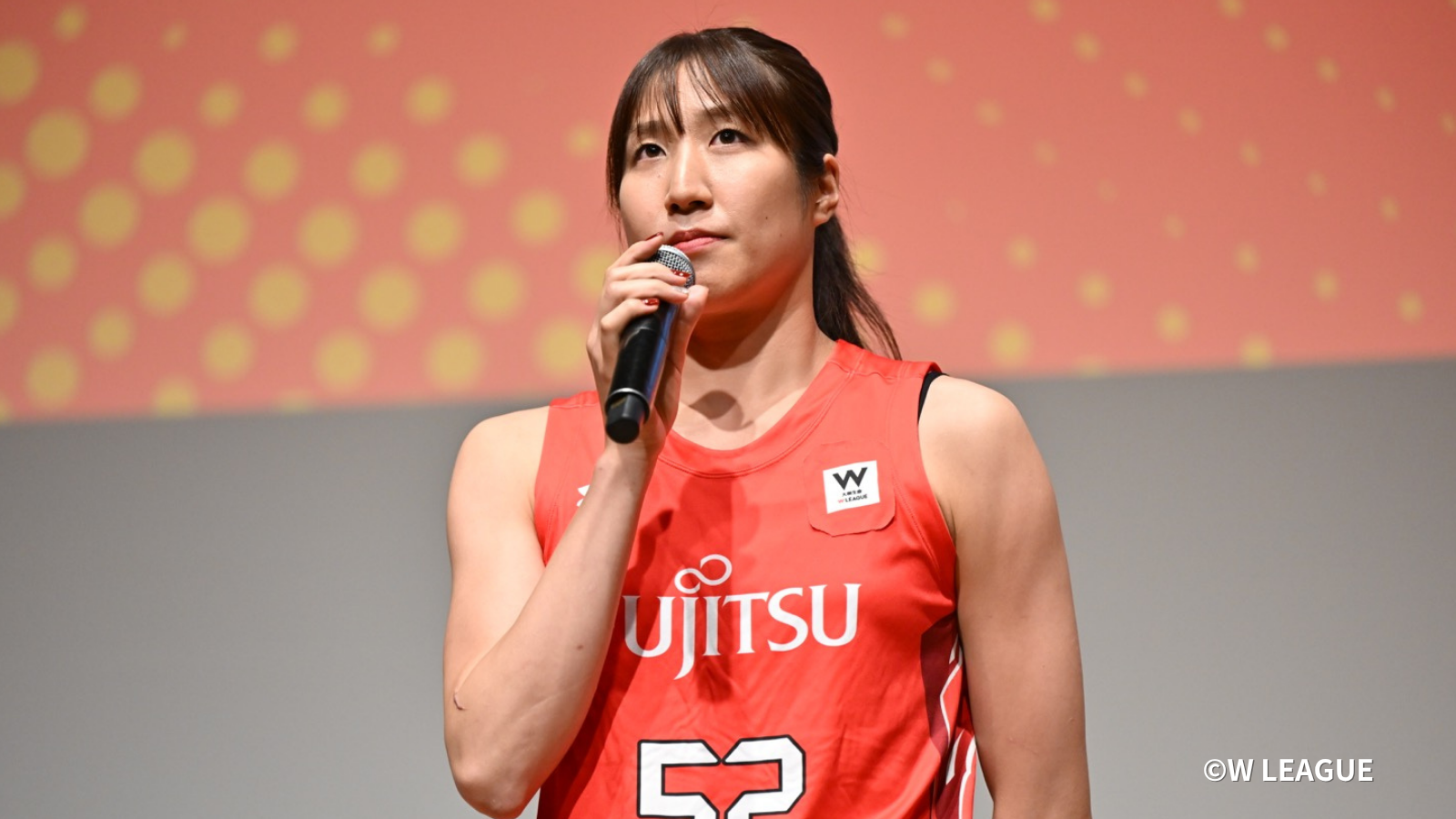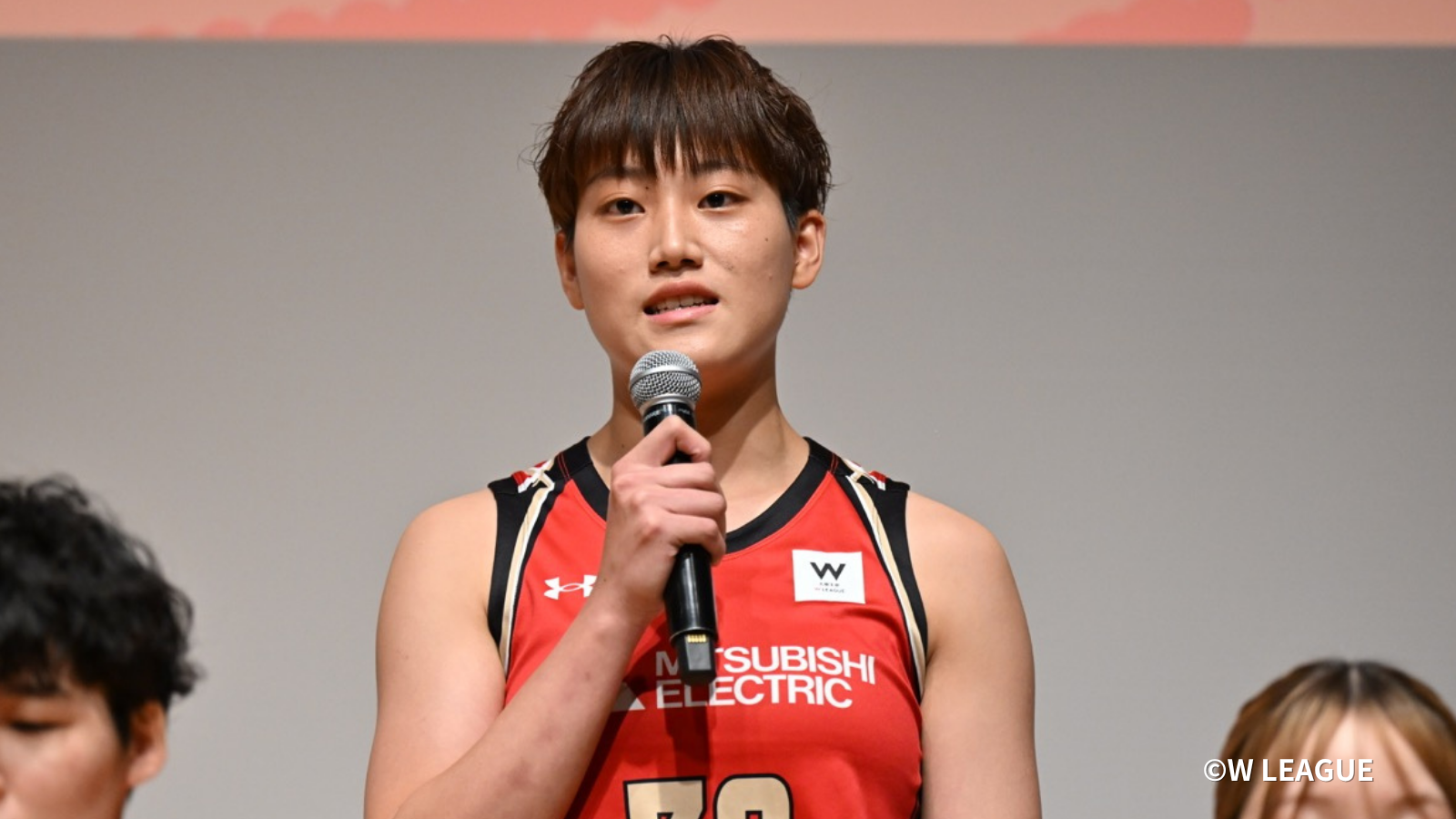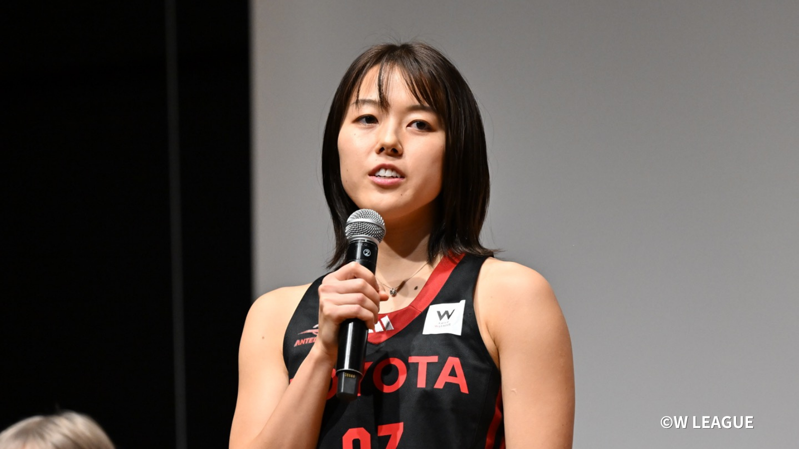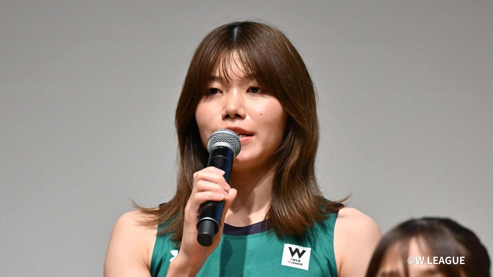 「本日は素敵な賞をいただきありがとうございます。私は小学2年生からバスケを始めて、その時からこの世界(Wリーグ)に入ることが夢でした。この夢の舞台で14年間、プレーできたことは本当に幸せに感じています。そして、たくさんの応援があったからこそだと思います。次のステージでも、自分らしく頑張っていきたいと思います。Wリーグの発展を心から祈っています。ありがとうございました。」