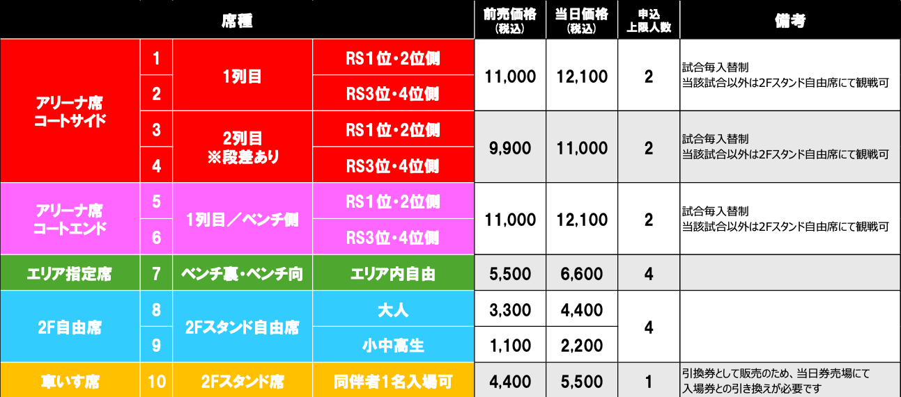 ※アリーナ席コートサイド・コートエンド・ベンチは1試合ごとの入替制になります。対象試合以外は