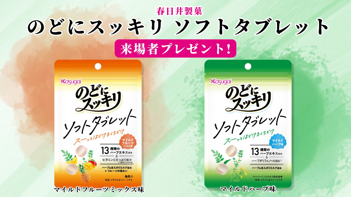1985年の発売以降、愛されつづけるロングセラー商品「のどにスッキリ」からソフトタブレットが登場!ファイナルステージでは、2/13・15にマイルドハーブ味、2/14にマイルドフルーツミックス味をご来場いただいた方々へお配りいたします!13種類のハーブエキスとビタミンCたっぷり配合。Wリーグ選手の応援と観戦のお共に、ぜひスーッとほどけるくちどけをお楽しみください♪