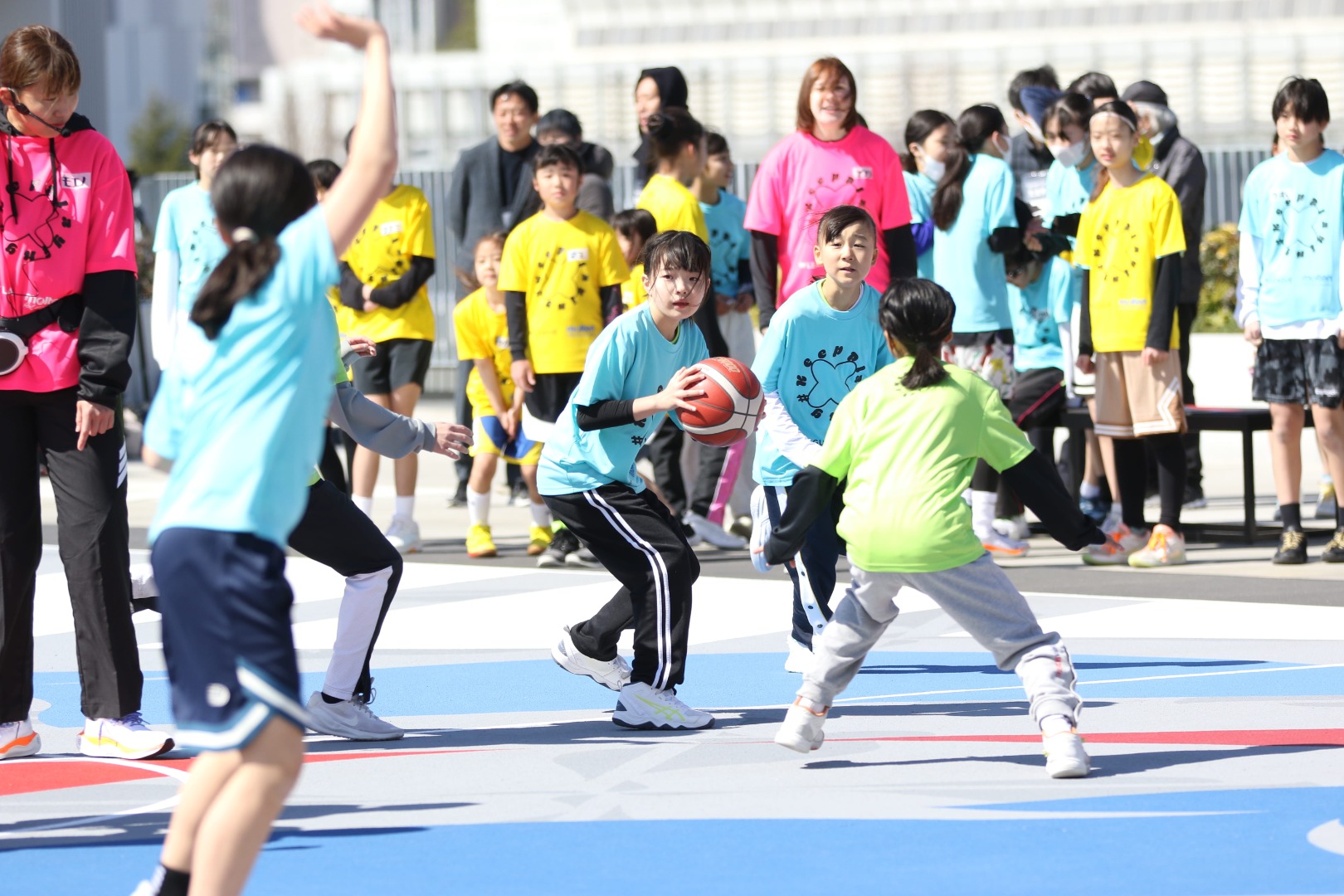 クリニックの最後はゲーム。試合では、パスを要求する声や「ナイスシュート」といったチームメートへの声かけなどといったシーンも見られ、参加選手がアグレッシブにプレー。また、ゲームには現役選手も参加し、小学生たちにとってはトッププレーヤーたちと一緒にバスケットボールをする貴重な時間にもなりました。