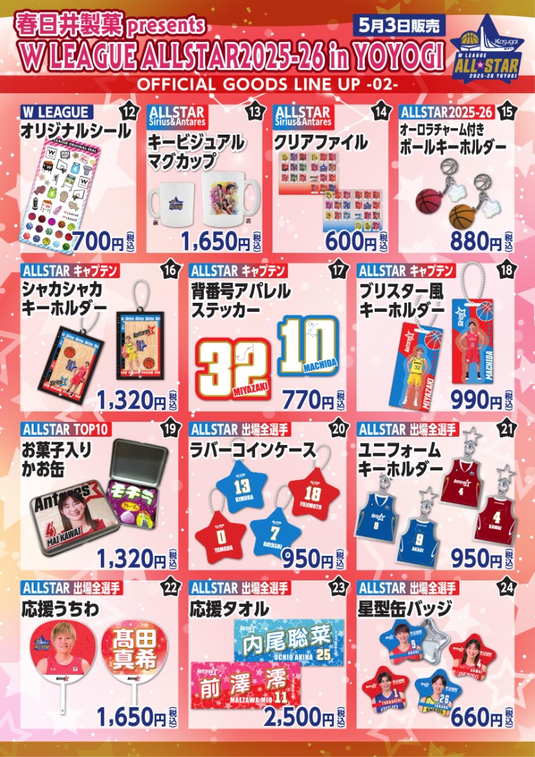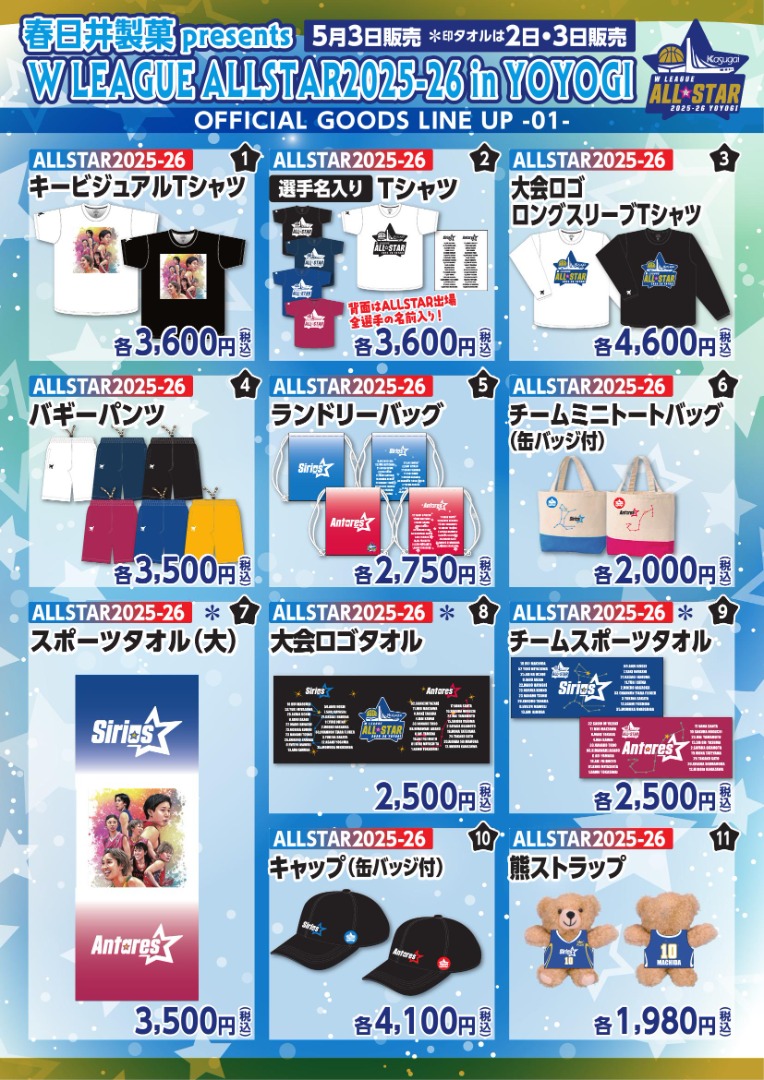 5月2日(土)に開催される『W LEAGUE AWARDS 2025-26』および、 5月3日(日・祝)『春日井製菓 presents Wリーグオールスター 2025-26 in 代々木』の会場にて販売するグッズ情報をお知らせいたします。